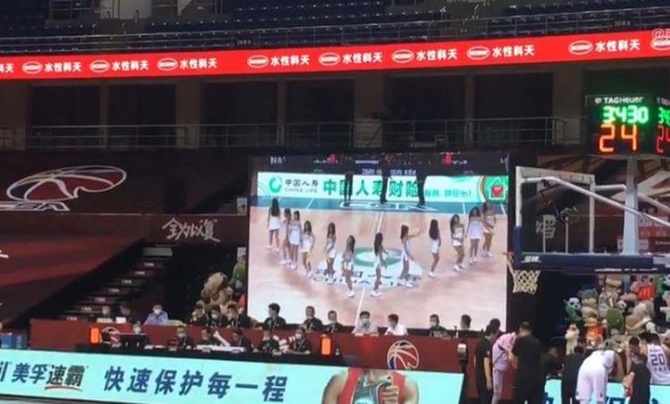 由于空场比赛,在暂停期间啦啦队员们现场云直播表演为球员加油助威。