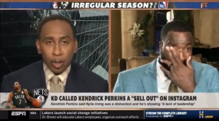 而当名嘴史蒂芬-A-史密斯解释‘叛徒(sell out)’这个词其实是很严重的指控,不应该随意使用时,帕金斯似乎抑制不住激动的情绪,擦拭着眼泪。