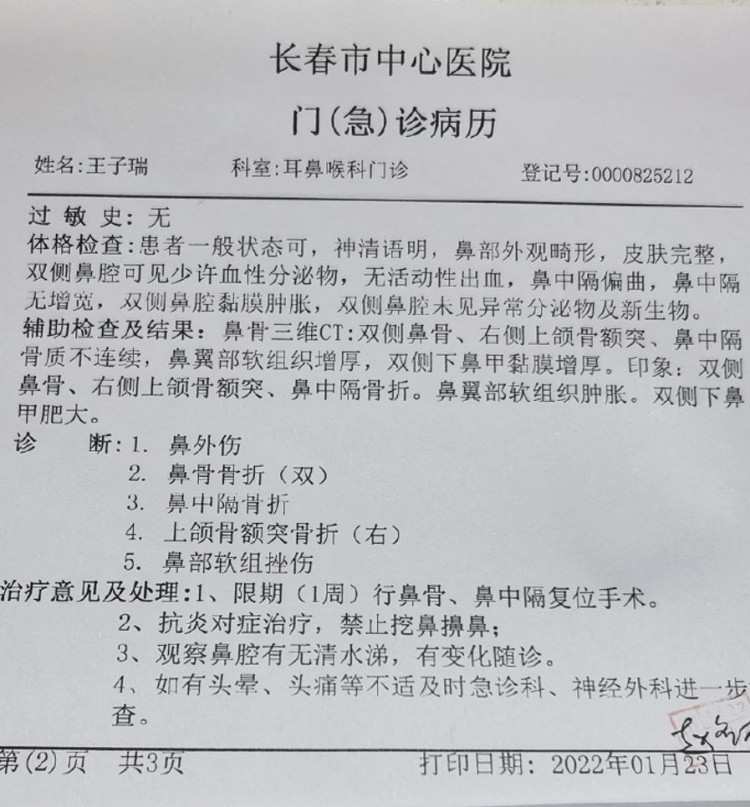 “在南京同曦与浙江广厦队比赛进行到第三节5分24秒,王子瑞在一次突破中被对手打到面部血流不止,当即被送往医院。经诊断为鼻中隔骨折,需要接受手术治疗。