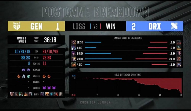 第三局前期DRX上单Doran的剑魔被打崩,Rascal的克烈有着单杀和游走中路的精彩表现。不过在团战端GEN接连犯错,DRX依靠着奥拉夫和卢锡安的发挥取得大优势,随后GEN也没有掀起太大的风浪,被DRX运营结束比赛。