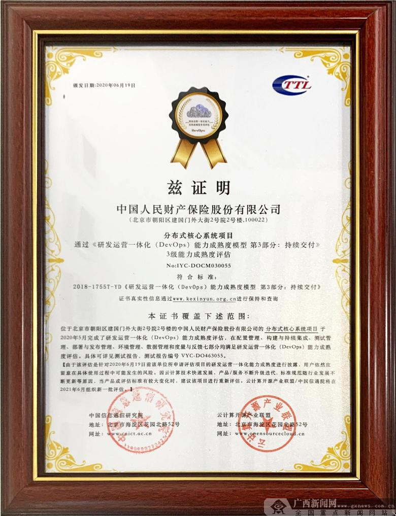 2020年6月19日,中国人保财险自主研发的分布式核心系统项目顺利通过由中国信息通信研究院开展的《研发运营一体化(DevOps)能力成熟度模型》系列标准持续交付部分3级评估。该项目是国内保险行业中首个达到DevOps标准持续交付3级能力的IT项目,这标志着中国人保财险的DevOps持续交付能力达到国内领先水平。