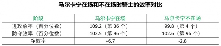 现阶段,马尔卡宁的三分潜力正在引发球队进攻端的连锁反应,虽然他本赛季投出了职业生涯最差的33.5%的三分命中率。当大个三人组都在场时,骑士的得分比平均水平略低;当阿伦和莫布里在场,却缺少他们的空间制造者队友(马尔卡宁)时,骑士的进攻简直是一场灾难。骑士的防守则在两种情形下都是同样的强力。