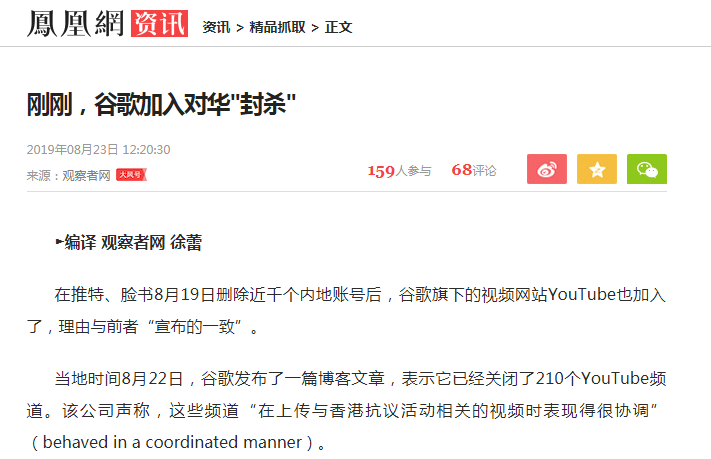 继推特、脸书8月19日删除近千个内地账号后,8月22日,谷歌表示其也加入“封杀”大军,关闭了210个与香港抗议活动相关的内地YouTube频道,这些频道无一例外都在客观中立的报道香港事件,并揭露暴徒恶行。早已不再坚守“不做恶”原则的谷歌,再次以行动证明了谷歌没有所谓光环,其就是一家商业公司,并已彻底成为美国家利益的鹰犬。