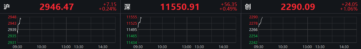 沪指低开后迅速翻红,创业板指高开高走涨逾1%。截至发稿,沪指涨0.24%,深成指涨0.49%,创业板指涨1.06%。