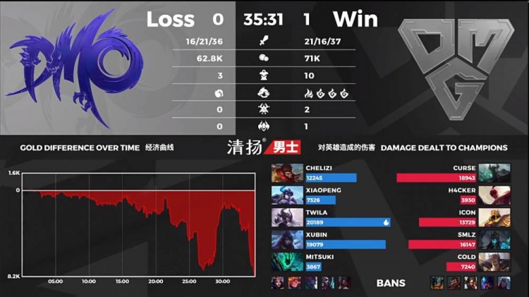 【18:50】DMO奥拉夫带悠米EZ三人想杀鳄鱼,打出一套技能后鳄鱼还剩丝血,OMG露露来到战场给出大招,奥拉夫遭到反杀。随后佐伊绕后进场,EZ和悠米也被击杀。DMO辛德拉姗姗来迟和露露一换一。OMG拿到大龙。