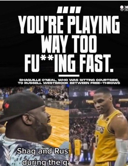 直播吧1月23日讯奥尼尔现场观看了昨日湖人客场对阵魔术的比赛,他还在比赛暂停期间给威少提了点建议。“你打得太TM快了。(Youareplayingwaytoofu**ingfast.)”奥尼尔说道。威