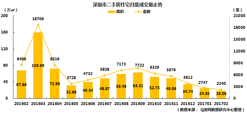 2017年2月,深圳全市二手住宅共成交2240套,环比下跌18.46%,同比下跌73.63%;成交面积19.06万㎡,环比下跌22.22%,同比下跌71.92%。