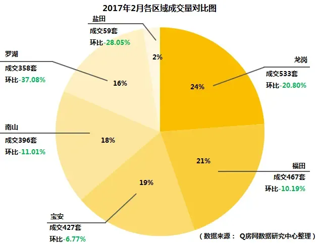 细分到深圳各个区域表现如下:在2月二手住宅成交中,龙岗区以533套的成交总量继续位列全市首位,占全市成交总量的24%;其次是福田区成交467套,占全市成交总量的21%;再次宝安区成交427套,占全市成交总量的19%;南山区成交396套,占全市成交总量的18%;罗湖区成交358套,占全市成交总量的16%;盐田区成交59套,占全市成交总量的3%。从环比情况看,六大区域环比持续下滑,其中罗湖、盐田和龙岗区降幅超过两成,相对更明显,其余三个区域降幅在一成左右。