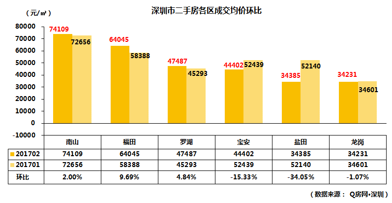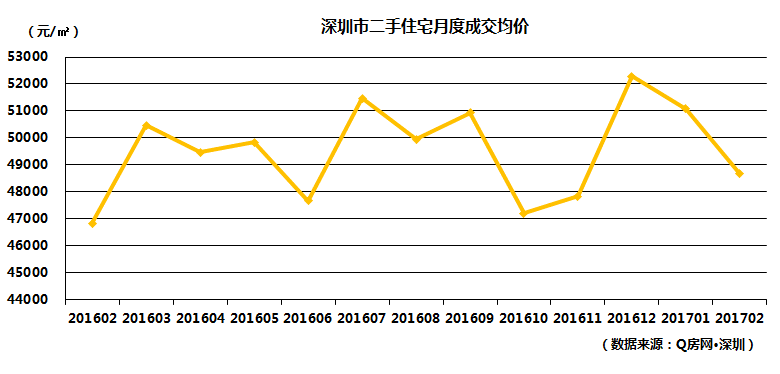 根据Q房网·深圳成交系统数据统计,2月份全市二手住宅成交均价为48663元/㎡,环比下跌4.72%,同比上涨3.93%。开年两个月单价持续回落,但环比变化幅度都在5%以内,与去年同期相比也仅有4%的涨幅。由于二手房业主的个体主观能动性较强,所以,价格变化趋势也更能反应市场实况,从实际效果来看,全市二手房整体价格出现一定的松动,但大部分下调幅度有限。虽然年后市场逐步恢复,但考虑到当前仍是政策紧缩的关键时期,不允许房价大起大落。