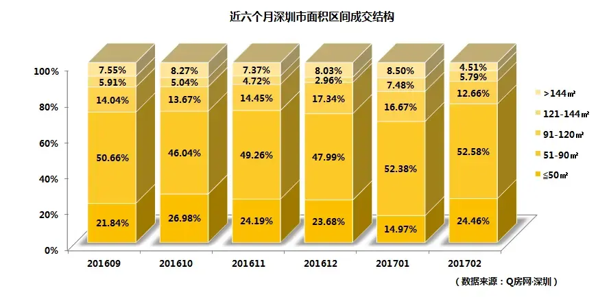 从成交面积区间结构图看,2月份占比最大的面积段依然是51-90㎡户型,成交占比52.58%,比1月占比提升了0.19个百分点;占比第二高为50㎡以下户型,成交占比24.46%,较1月提升了9.5个百分点,也是2月份占比提升最大的面积段;相对来说,中大户型的占比都出现萎缩,其中91-120㎡以及144㎡以上户型都比1月份缩小了4个百分点,与小户型的占比提升相比形成鲜明对比。