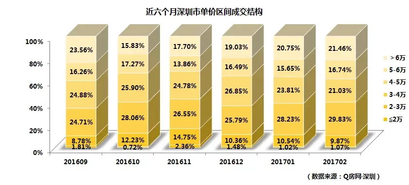 从各区域成交均价来看,继续保持三大梯队,其中第一梯队的南山区维持“7字头”;福田重新恢复“6字头”;第二梯队,罗湖和宝安,“4字头”;第三梯队,盐田和龙岗,“3字头”。环比方面,六大区域涨跌参半,其中南山、福田、罗湖环比上涨,其他区域环比下跌。由于主力成交区域龙岗区及宝安区的环比下滑,对全市的均价形成下拉力,而且宝安区下滑幅度较大。