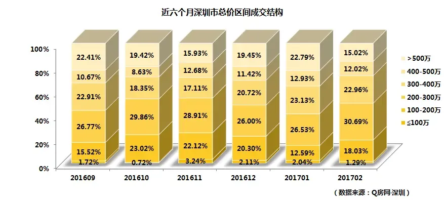 从成交总价区间结构图看,市场份额最大的部分为200-300万产品,占比30.69%,较上月占比提升4.16个百分点;其次为300-400万部分,占比22.96%,占比较1月萎缩0.17个百分点。由于2月份小户型占比提升明显,所以200-400万依然占据绝对主力,甚至100-200万产品占比也有所提升。