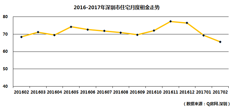 根据Q房网·深圳成交系统数据统计,2月份全市商品住宅租金为65.62元/㎡,环比下跌5.41%。过完年后,租赁市场活跃度明显回升,但是目前的租赁市场面临量大难题,一个是长租公寓等新兴市场的出现分流了一部分租客,另一个是前两年旺盛的市场销量出现了更多的“房东”,两者叠加加剧商品房市场租赁需求弱化。从具体2月份的数据来看,显然还不及去年同期的租金水平,与样本量的倾斜也有一定的关系,南山、福田等高租金片区租房量占比萎缩,其他区域占比提升。