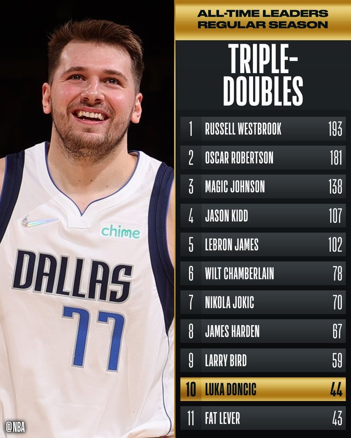 东契奇44次三双超越名宿法特-利弗,独占历史第十,前面一位是伯德(59次)。