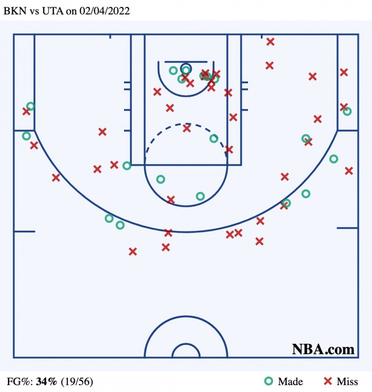 数据显示,篮网半场共出手16次中投,投进5球,而爵士中投1中1。