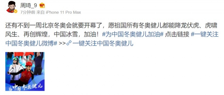 周琦写道:“还有不到一周北京冬奥会就要开幕了,愿祖国所有冬奥健儿都能降龙伏虎、虎啸风生、再创辉煌,中国冰雪,加油!#为中国冬奥健儿加油# ”