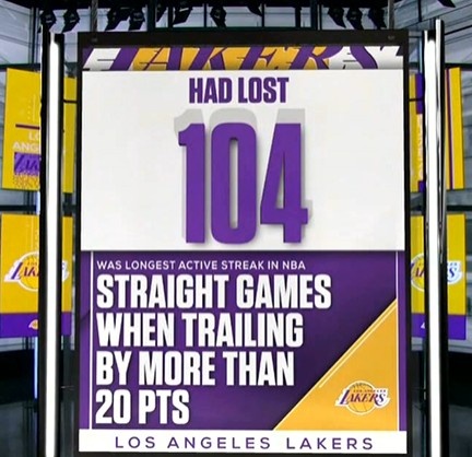 据统计,湖人在落后超过20分的比赛中已连输104场,原本是NBA现存的最长纪录,今天被终结。