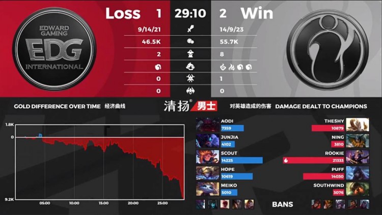 【23:10】EDG奥恩想要开团但是E撞空,IG一波反打击杀EDG三人。随后IG想要一波,IG杰斯一炮打残卡莉斯塔,EDG多人复活来团,IG轻松击杀四人结束比赛。
