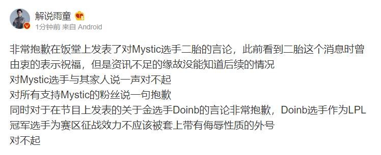 6月21日讯 在进入LPL夏季赛后的饭堂节目中,解说雨童因为一些过于敏感的言论被网友微博爆破,随后雨童在微博道歉。