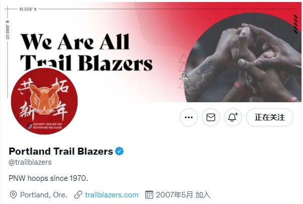 2月1日讯正值大年初一,开拓者官方推特更新了球队的头像,换上了带有“共拓新年”标语的照片作为头像,以此向中国球迷发来新年祝福。