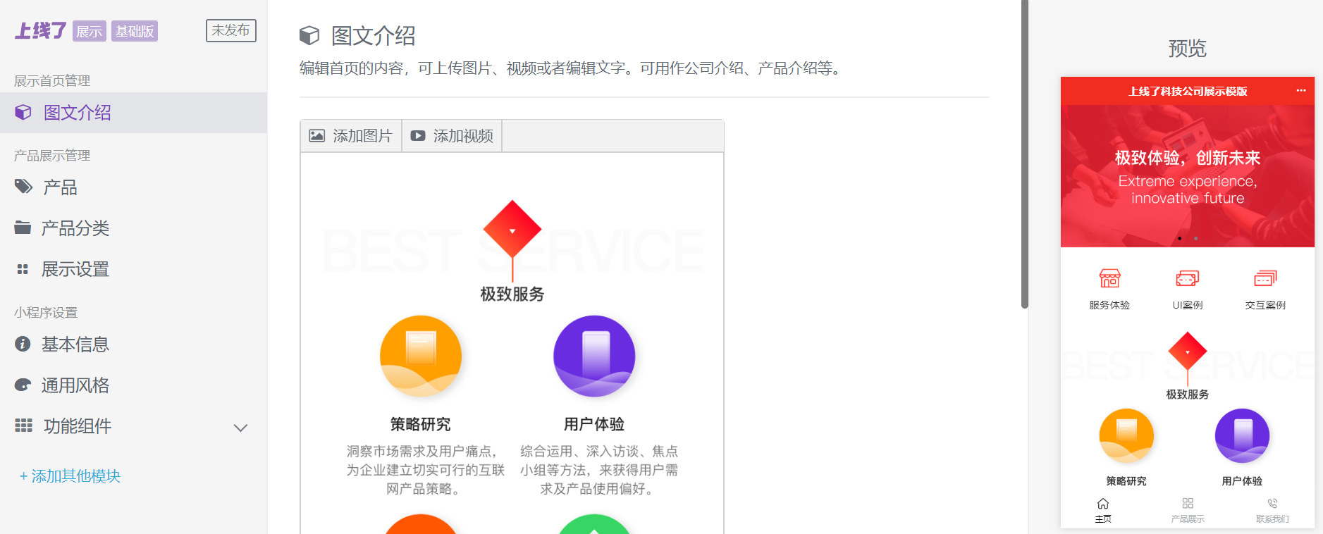 点击左侧【图文介绍】,你可以添加图片和视频,在主页展示自己。点击【产品】,可以添加新的产品展示和产品分类。