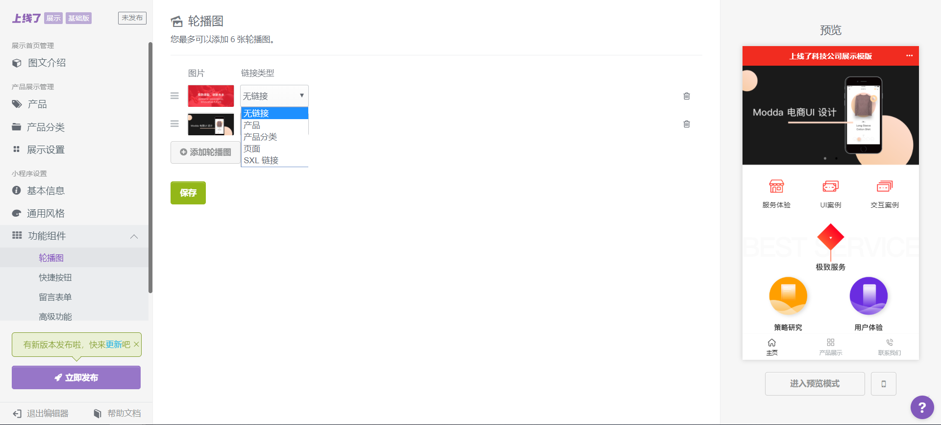 在【功能组件】中可以添加海报轮播图、快捷按钮、留言表单,方便访客更快地找到相应产品,提高浏览效率。