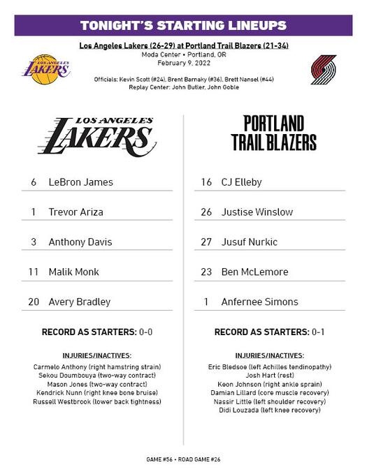 赛前,湖人和开拓者的首发出炉: