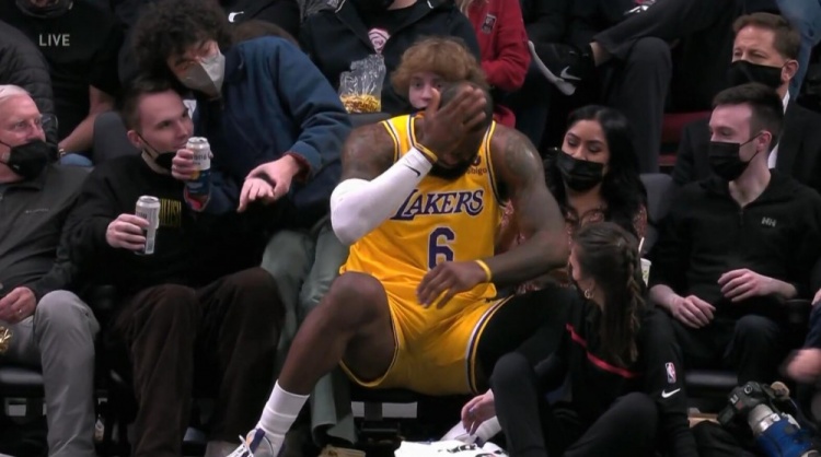 詹姆斯上篮被对手打到头部,他顺势坐到了场边第一排的观众席里,缓了一下,随后回到了比赛。