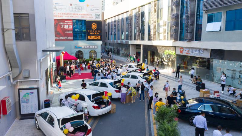车尾灯随着夜幕逐渐亮起,便来到“尾箱集市·创业先锋”活动环节,多才多艺的青年团员们为赚取创业发展的第一桶金而使出浑身解数:手拉柠檬茶、特色烘焙糕点、手工防疫香包、温馨浪漫花束、DIY创意玩具等等。现场人潮涌动、万人空巷,叫卖声、招呼声、砍价声此起彼伏。南山区人大代表、1956文化创意园董事长郑佳鑫亲自带货,他说道,在新时代中国特色社会主义思想引领下,青年团员活跃在社会的各个地方。不管我们从事哪种工作,我们的目标都是一样的,那就是建设好我们的国家。青年团员作为党的后备军,奉献力量,和党一起努力,和党一起奋斗,和党一起创业,为祖国发展、为党的发展注入源源不断的活力和青春动能。作为一名人大代表、一名企业家,助力复商复市,激活消费热点,促进中小企业的发展,增进群团组织协同合作,加强基层资源统筹使用势在必行。”