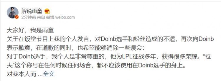 6月22日讯 今日解说雨童再次发博向Doinb以及他的粉丝道歉,并且澄清误会自己并没有使用“金拉夫”这一词汇。
