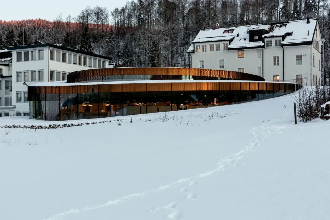 第一眼看过去,玻璃展厅像从地里破土而出,盘绕而上,夏季隐在绿葱葱的风景里,冬季则与皑皑白雪共融一片。