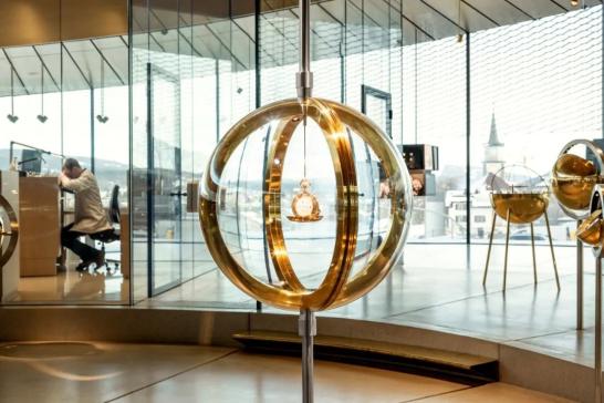 在展览空间,每块表都摆放在一个金属盒内。球形展柜的布局如同行星围绕着太阳,让人联想到宇宙和天体的运行规律。