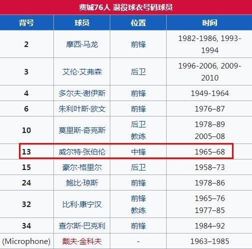 76人的13号球衣曾属于张伯伦,也早就被退役了。