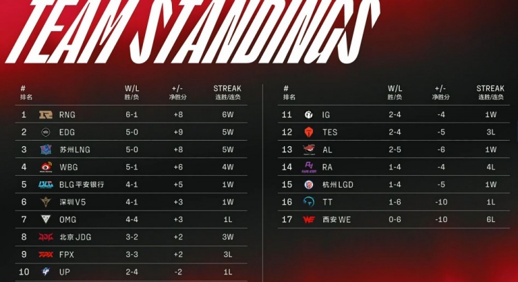 2月12日讯 今日LPL春季赛RNG对阵TES的比赛已经结束了,最终RNG以干净利落的2-0横扫TES豪取六连胜;目前他们除了首场比赛输给FPX以外,RNG连续击败了JDG、TT、AL、iG、BLG、TES六只队伍,以6胜1负的战绩排在LPL积分榜第一位。