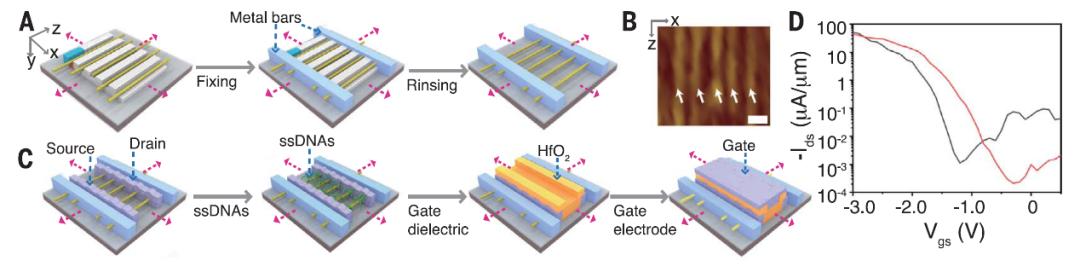 近日,北京大学信息科学技术学院电子学系/北京大学碳基电子学研究中心、纳米器件物理与化学教育部重点实验室孙伟研究员课题组及其合作者,探索了生物-碳纳米管复合界面及大面积取向排列的调控新方法。相关研究成果以《核酸引导的高性能碳纳米管晶体管的制备》为题,在线发表于《科学》。