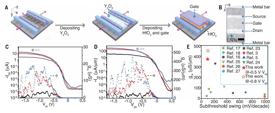 经过界面工程,基于生物模板的碳管阵列晶体管显示了良好的开态性能和快速的电流开关切换,展现出了高精准度生物模板在高性能晶体管领域的应用潜力。
