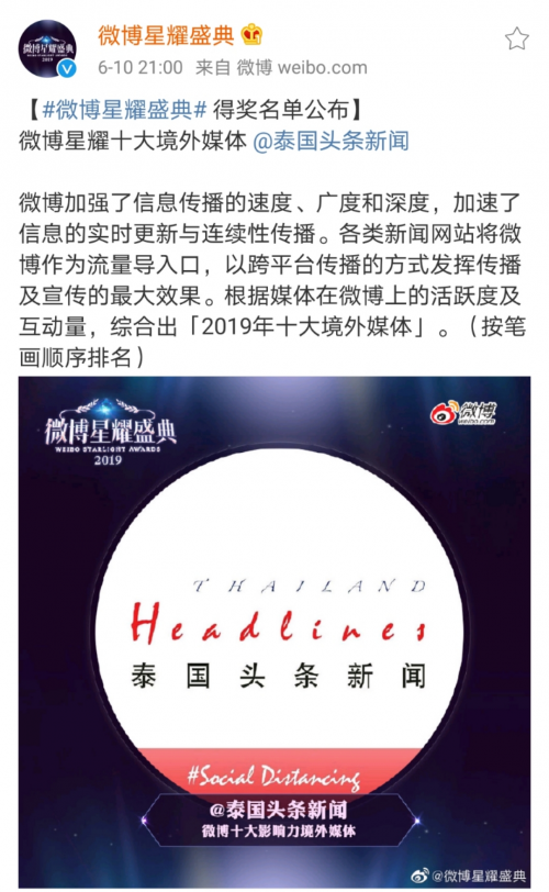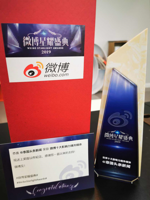 6月10日,新浪微博星耀盛典官方宣布:泰国头条新闻荣获新浪微博十大影响力境外媒体奖项,这是泰国以及东南亚地区唯一一家上榜该十大影响力榜单的媒体,亦是泰国以及东南亚地区首次有媒体获此殊荣。