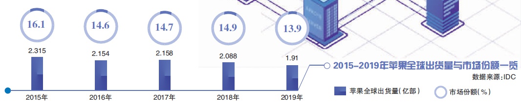 近五年,iPhone在全球市场的市场份额也在下降。IDC公布的数据显示,2015年iPhone全球出货量为2.315亿部,市场份额为16.1%;2019年出货量为1.91亿部,市场份额为13.9%。