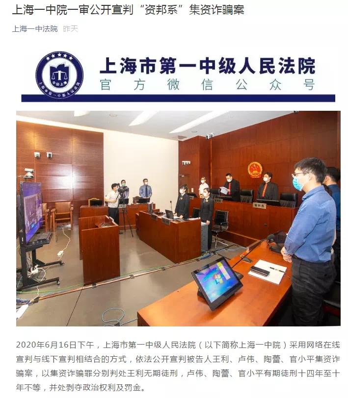 2020年6月16日,上海市第一中级人民法院对被告人王利、卢伟、陶蕾、官小平“资邦系”集资诈骗案进行了一审判决。