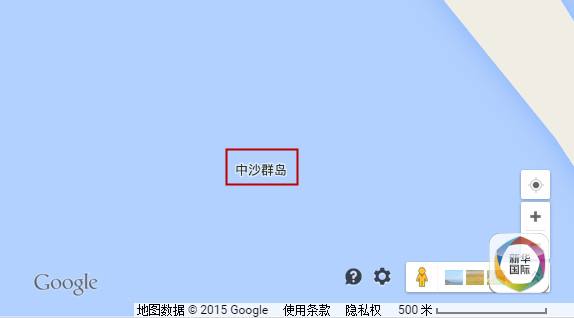 目前虽然“黄岩岛”中文标注已经被移除,但当比例尺放大到500米时,仍可以在地图上看到“中沙群岛”的中文标注。