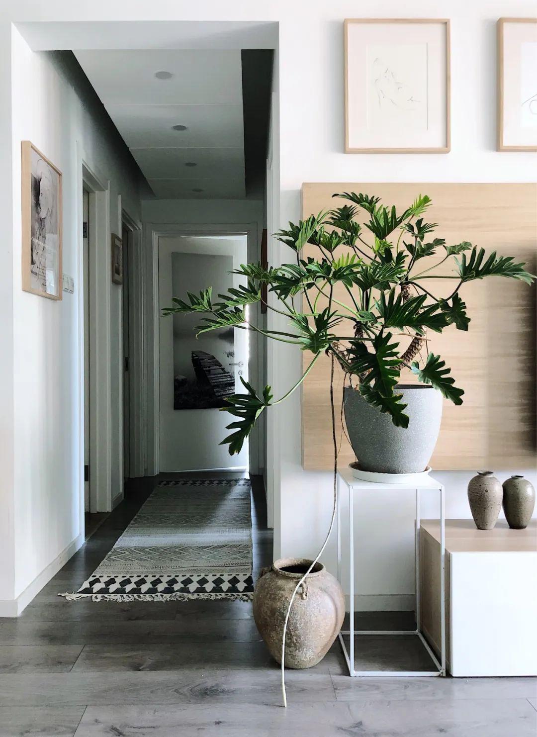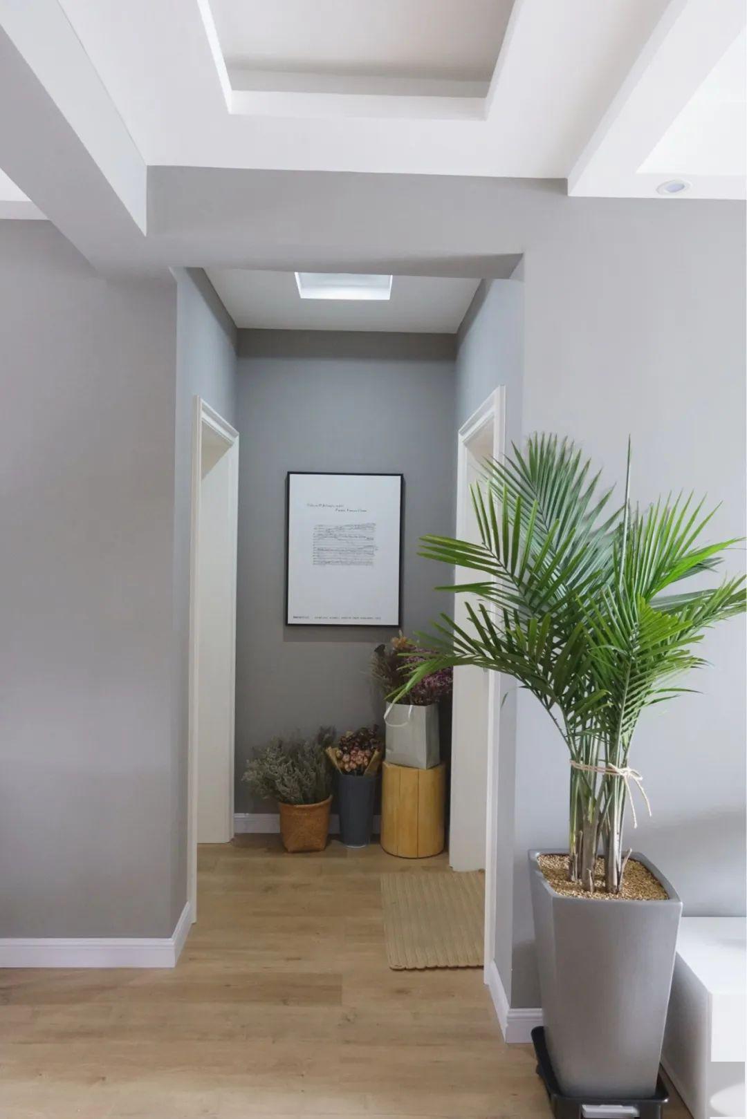 如果房子的层高比较高的话,也可以把整个走廊的天花都吊平,然后把筒灯装到天花里面,维持一个简洁平整的走廊空间,这样简单大方的设计,带来的空间感也是简约自然而又舒适。
