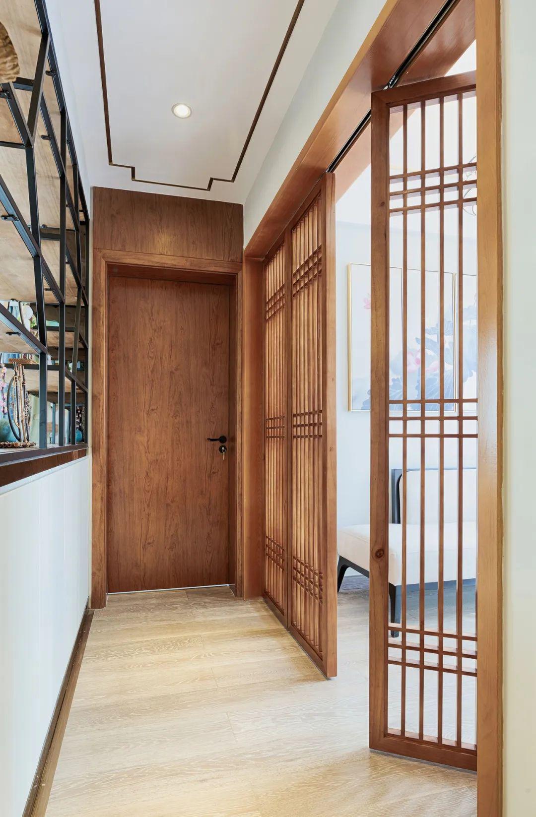 在吊顶里加装饰线条比如金属或木质的线条,可以让吊顶显得更加雅致层次,这样的设计在轻奢、中式风格中是比较常见的手法,通过这样简单的金属或木质元素融入,可以强调走廊空间的风格。