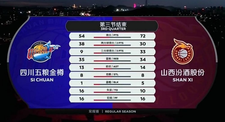 易边再战,袁振梁拿下篮板两分打进吹起了四川的追分号角,山西这边进攻效率下降,李原宇接球跳投命中,陈辰三分也有,一波7-0打停山西(39-49),比赛回来李原宇两分还有,随后两队僵局之中出现较多犯规,此时山西刘冠岑站了出来,突破得手,随后反击之中底角接球,三分再中,四川喊出暂停(41-54),比赛回来原帅与景菡一互飙三分,随后陈辰跳投命中重新缩小差距,拉锯战中时间来到本节末段,原帅连拿五分为山西扩大领先,闫鹏飞三分也有,尽管李原宇连拿四分,原帅三分再中,分差来到20分(52-72),最后时刻,四川田桂森错位打成,三节结束,山西72-54领先四川。