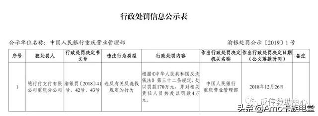 1月2日,人行重庆营业管理部发布的行政处罚信息公示显示,随行付支付有限公司(以下简称“随行付”)重庆分公司,因违反有关反洗钱规定的行为,被处以罚款170万,并对相关责任人员共处以罚款4万元。
