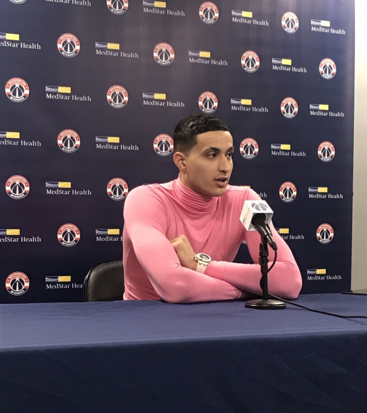 赛后,奇才前锋库兹马出席了新闻发布会。只见库兹马身穿一件骚气粉色高领紧身衣,肌肉线条格外醒目。