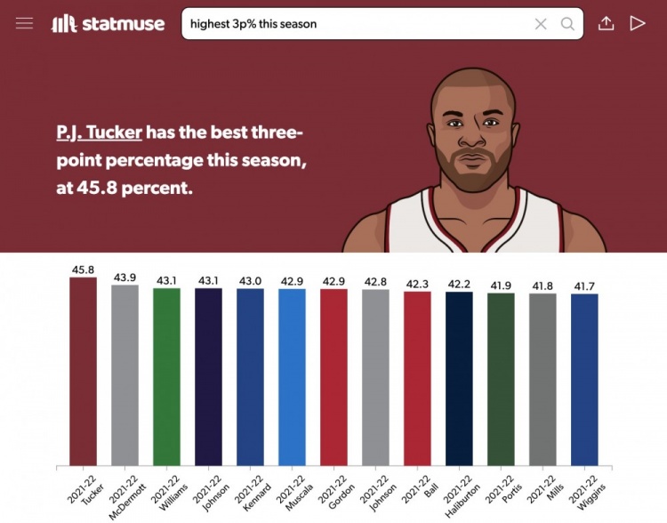 2月16日讯 今日美媒StatMuse罗列了本赛季NBA球员的三分命中率榜单,PJ-塔克以45.8%的命中率高居榜首,具体排名如下: