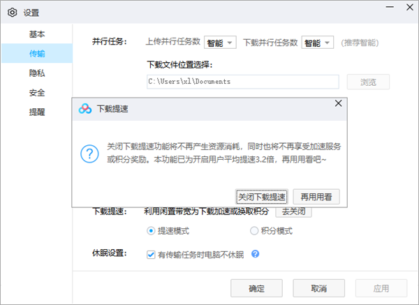 据介绍,“下载提速”是将电脑的空闲上传带宽组建成特有的传输通道,为使用电脑端下载并进入传输通道的文件加速。上传带宽将会持续优化传输通道的质量,通道质量越高,加速效果越明显。