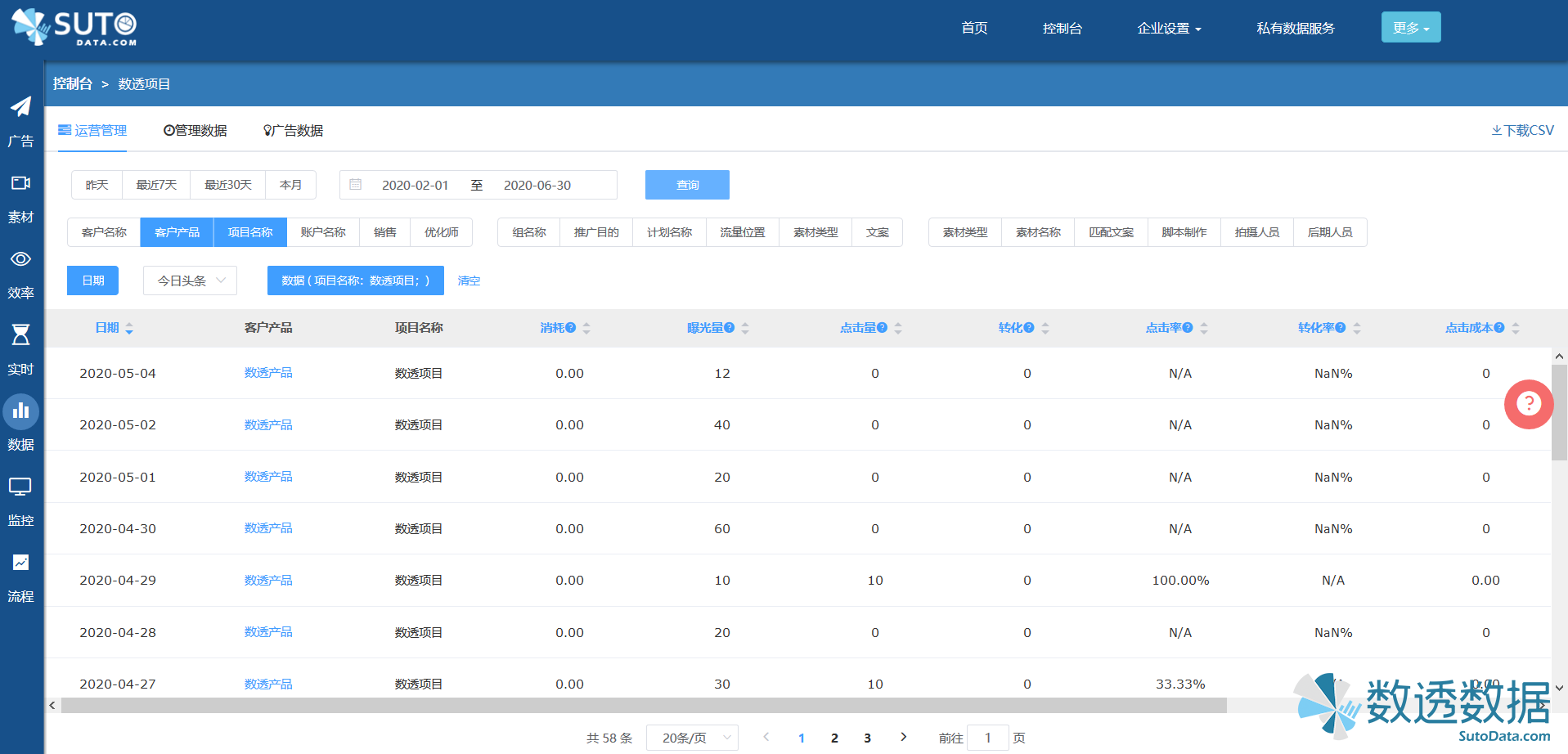 数透数据实现跨平台和跨账户和跨纬度的数据自动汇总,数据模块可以查看到从脚本制作,拍摄人员,后期人员等不同工作阶段的员工对于投放数据的贡献比例,而且也不需要投放人员手动下载各个渠道各个账户的数据。在数透数据的数据报告界面,选择要分析的数据维度后,就可直接查看分析或者下载CSV一键导出。