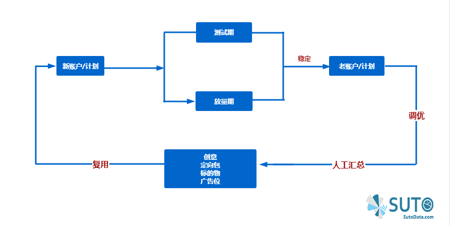 升级后的广告投放流程,可以实现新账户快速冷启动,监控模块及全渠道的数据报表,从整体上加速批量复用计划的过程。