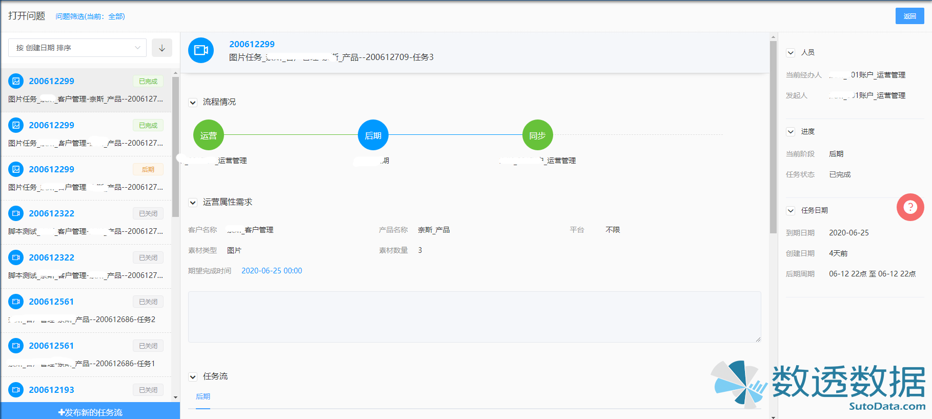 系统采用流程模组化设计,可根据不同的业务需求自定义生产流程;指定流程后各环节均会绑定流程经办人;优化师通过素材生产管理系统,创建不同类型的素材需求任务,查看各环节工作进度及工作成果。素材同步媒体后,系统将提供各环节的效果数据。比如某个员工所参与生产的全部素材平均点击率是多少。为落实工作流程,提升工作效率,工作成果数据化提供有力保障。